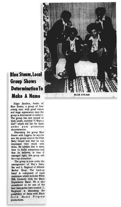 Their line-up included the singers Pierce McKoy, McDuffy Holman III, Frederick G. Duff, and Edgar Saunders. Blue Steam made one record that featured the sweet soul tracks “Where Is She?” and “I Want a Girl.” Said to feature the rhythm section of Kool & the Gang, this release came out on a New Jersey label.