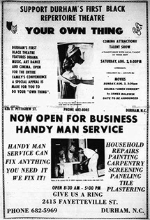 In 1969, African American students from Duke University and North Carolina College for Negroes (now NCCU) organized a black arts and music festival for the first time in Durham. Named in honor of the Afro-Caribbean celebration Bembe, the festival is still held annually and has become a Durham institution. Over the years, Bimbe featured many soul artists, including Blue Steam and Duracha in 1976, as shown in this newspaper advertisement.